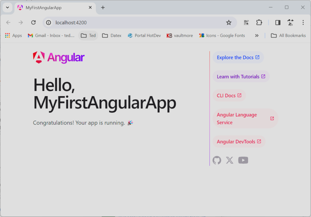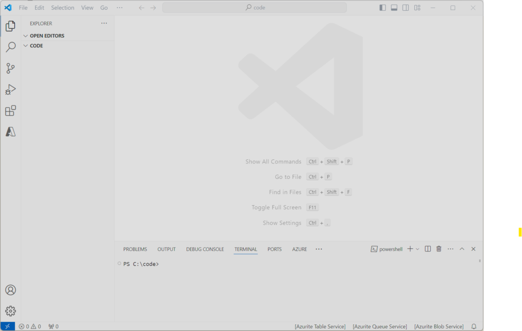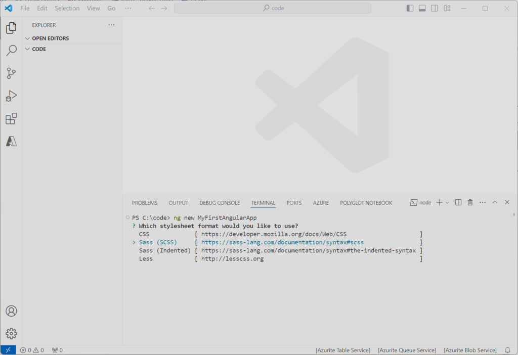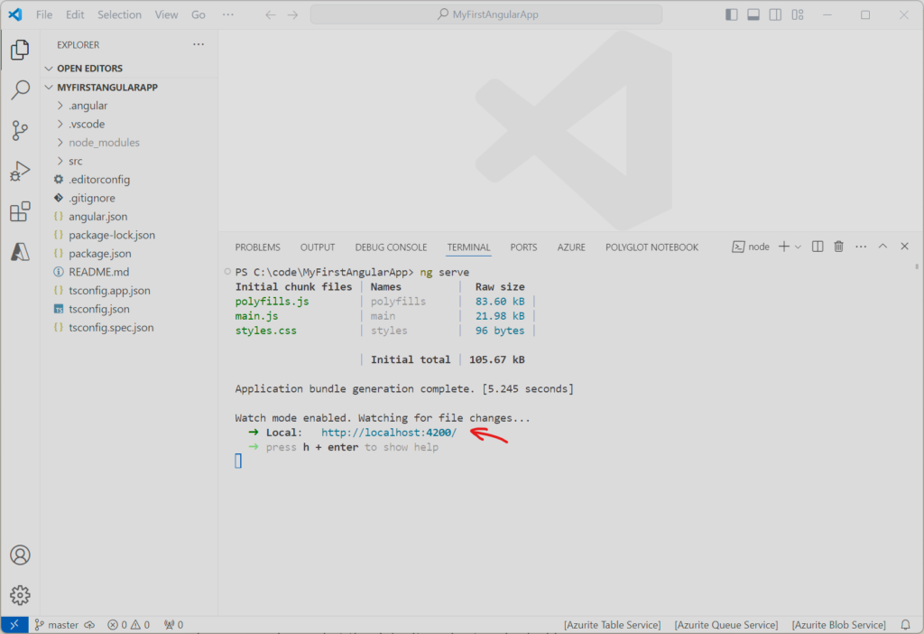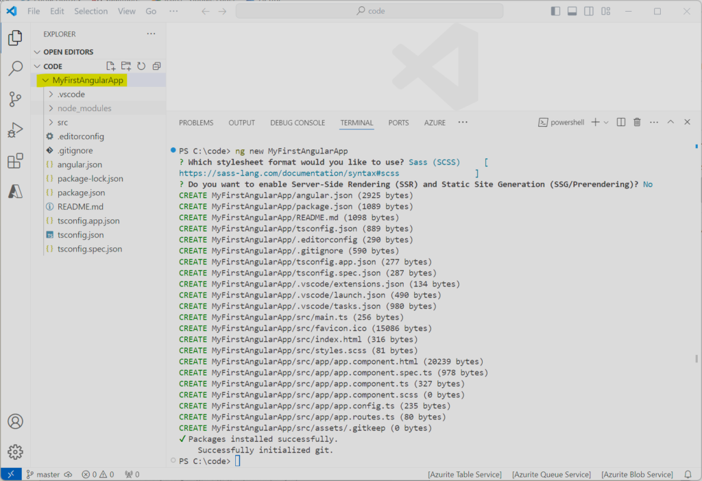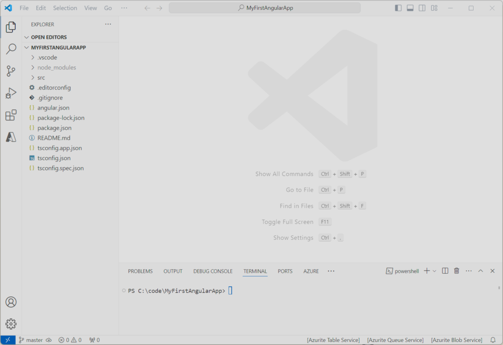 1. After VSCode refreshes, we’ll now see that MyFirstAngularApp is at the root of the folders tree, and after opening the terminal window, we can see that the current directory is “C:\code\MyFirstAngularApp“.
