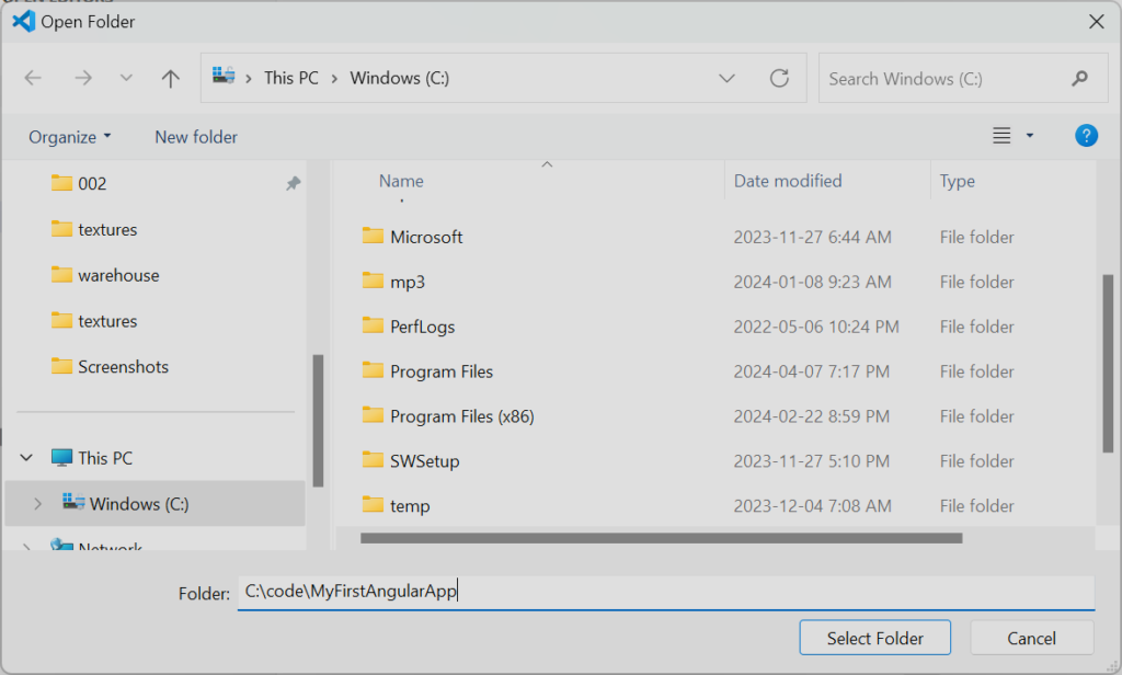 3. Now type “C:\code\MyFirstAngularApp” as the folder name and click “Select Folder“.