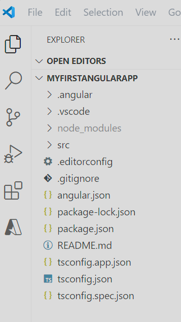 • favicon.ico if you look at the tabs in your browser, you’ll notice that each tab has an icon in front of it. Our MyFirstAngularApp has one as well, and if you click on this file in the folder tree, you’ll see this image appear in VSCode. That’s what this image file is used for.